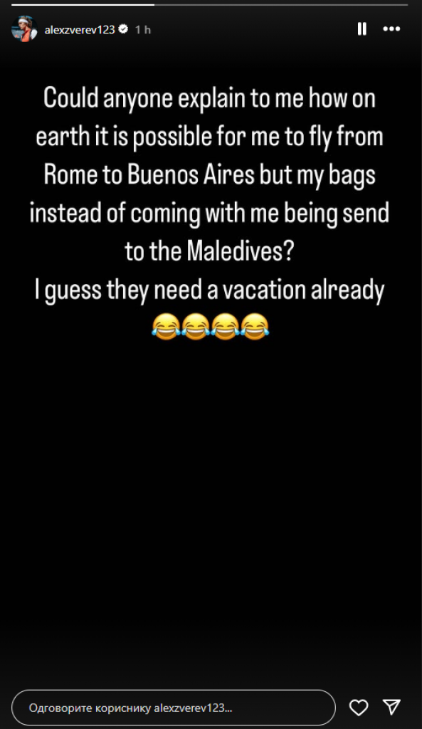 Zverev je preko Rima putovao za Argentinu, dok je odlučio da jednu komičnu situaciju podeli na svom Instagramu. On je napisao kako su njegove stvari umesto za Buenos Ajres otišle za Maldive.